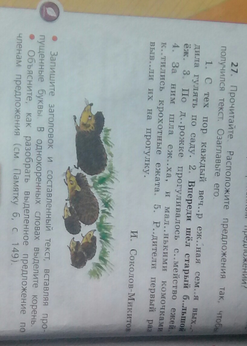 С тех пор каждый вечер еж.ная семья выходила гулять по саду.Впереди шёл старый большой ёж.По дорожке прогуливалось семейство ежей.за ним шла ежиха,и малиньками комочками катились крохотные ежата.Родители первый раз вывали их на прогулку.