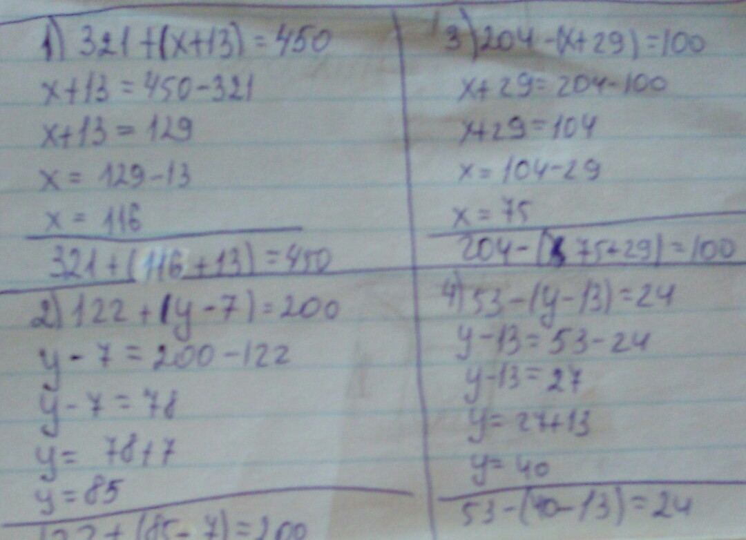 помогите пожайлуста решить уравнение срочно 1)321+(х+13)=450; 2)122+(у-7)=200; 3)204-(х+29)=100; 4)53-(у-13)=24
