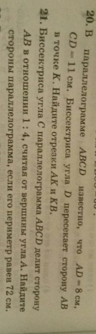 биссектриса угла параллелограмма отсекает от параллелограмма равнобедренный треугольник, т.е. AK=AD=8, а поскольку AB=CD, то KB=11-8=3