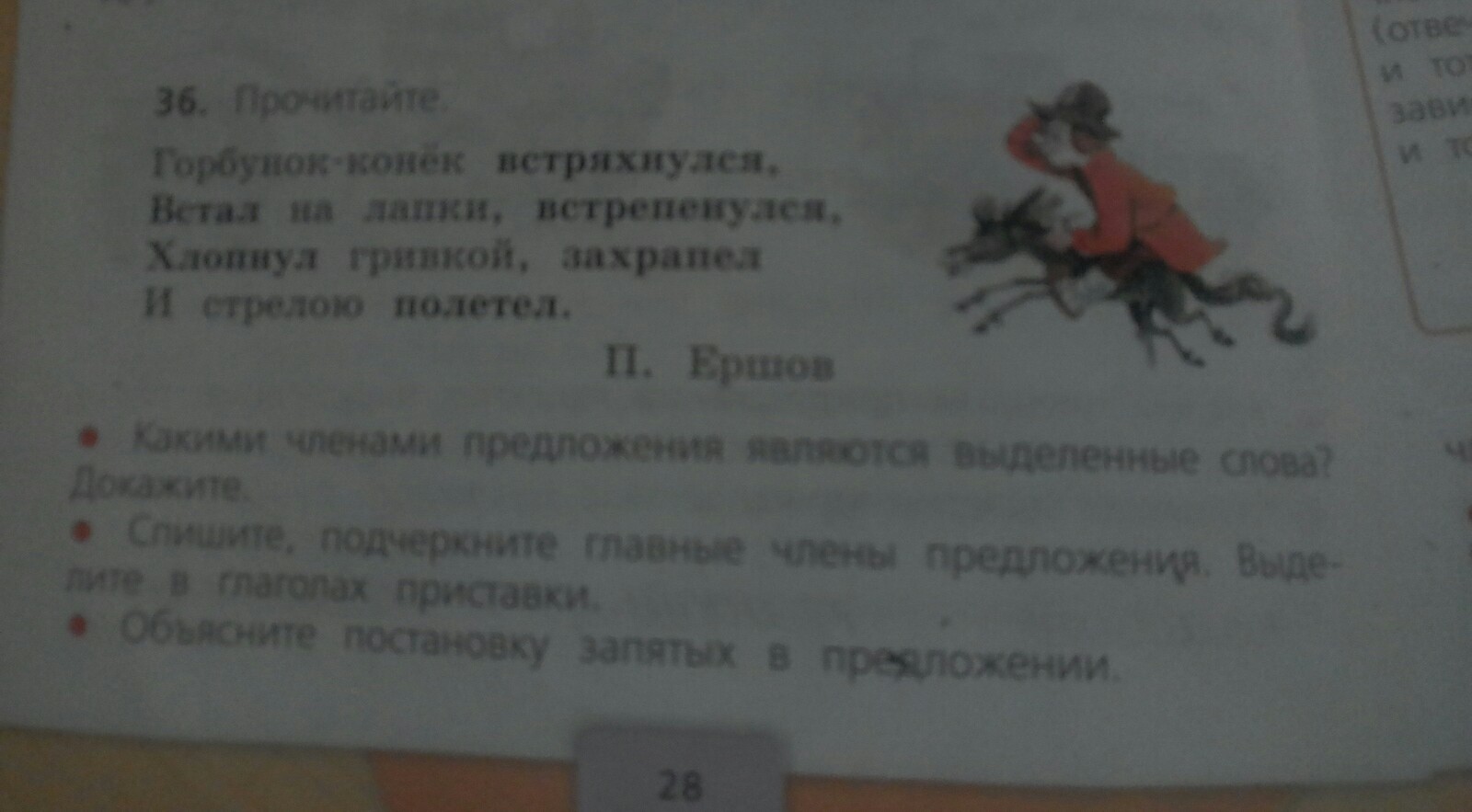 2. Главные члены предложения: подлежащее, сказуемое. например : Горбунок- конек встряхнулся- Горбунок конек- подлежащее, а встряхнулся-сказуемое. Предмет-его действие. А приставки это просто: обозначаешь корень слова, все , что перед ним осталось-это приставка.