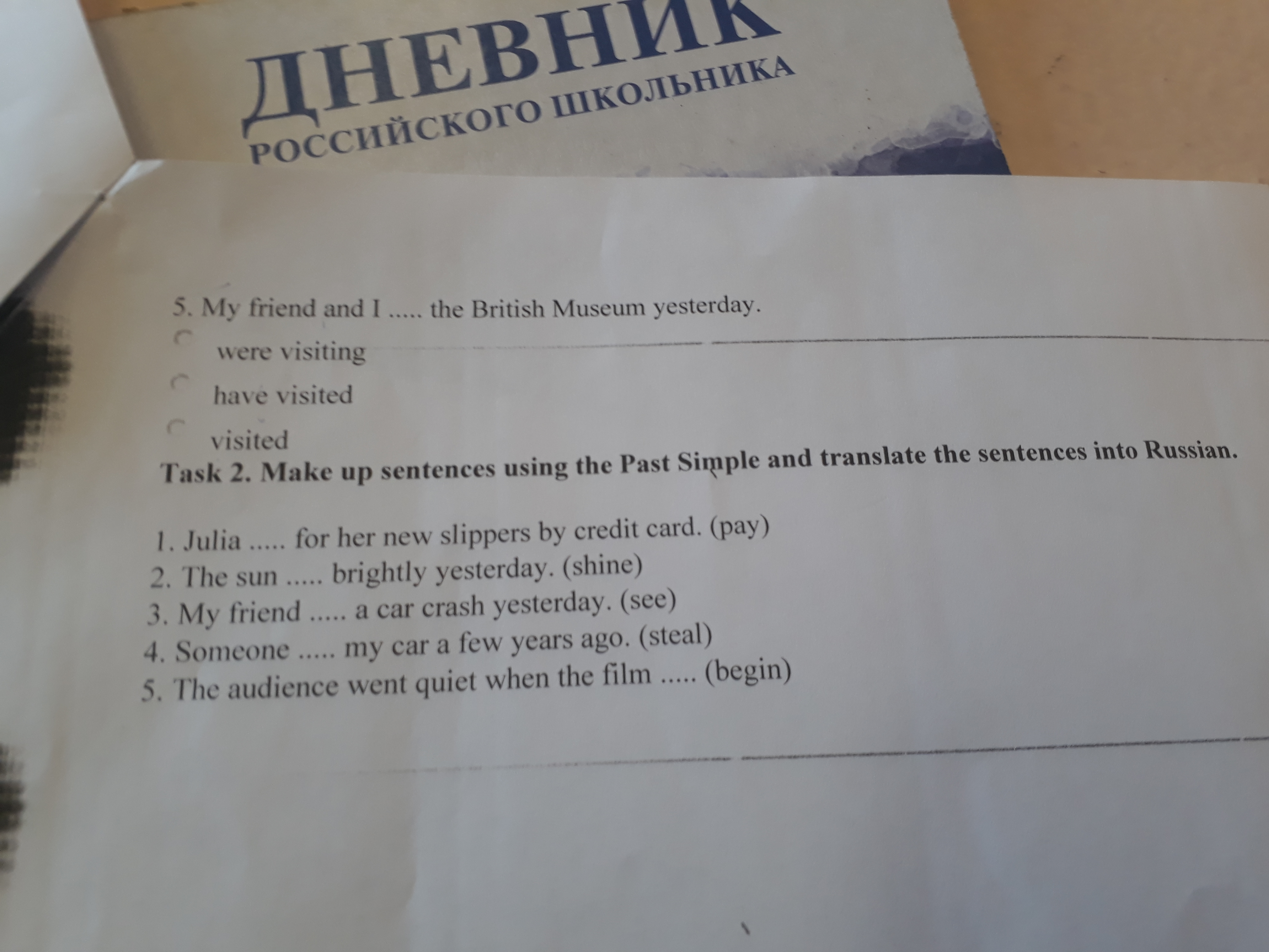 Task 2: 1. paid(Джулия заплатила за свои тапочки кредиткой)