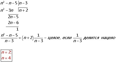 (n^2-n-5)/(n-3)=((n-3)^2+5(n-3)+1)/(n-3) = n+2+(1/(n-3)) , откуда n=4 или n=2