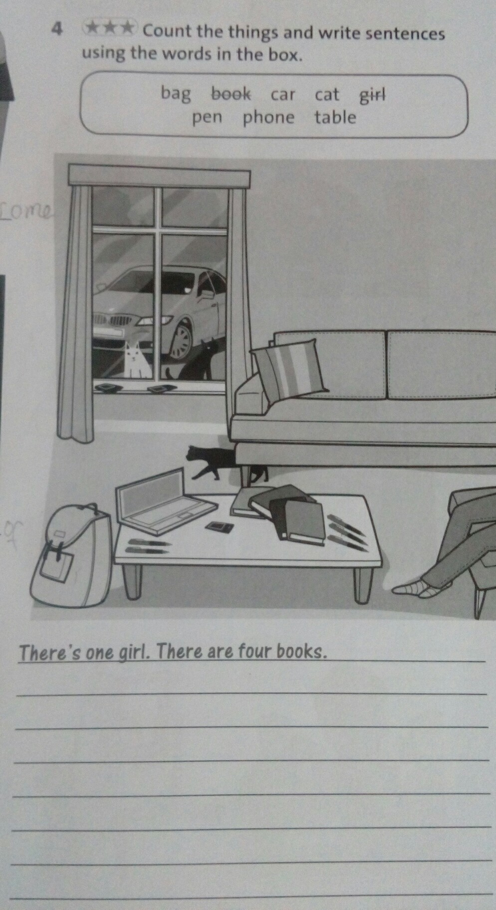 There is one mobile phone, there's one bag, there's one car,there are three cats, there are five pens,there is one table. Все ;)