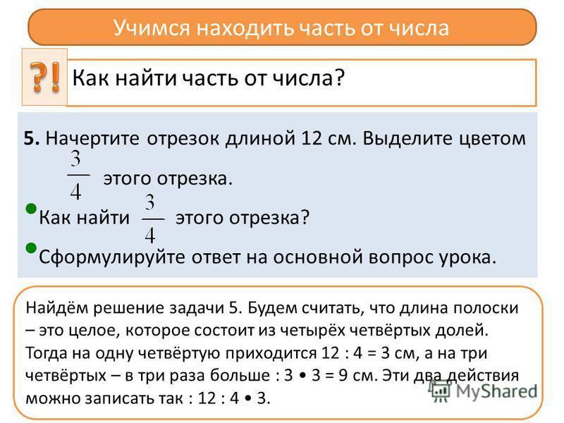 Начертите отрезок длиной12 см. Выделите цветом 3/4(Дроби) этого отрезка. Как найти 3/4 этого отрезка?