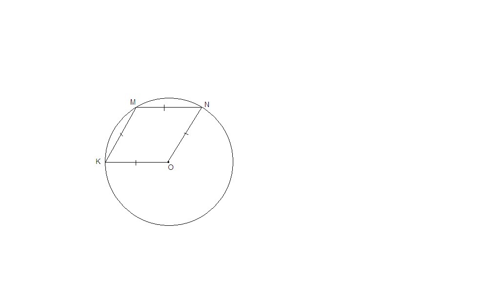 Диаметре окружности равен 35 см. Длина хорд МК и МN равна радиусу, центр О окружности лежит внутри угла КМN. Найдите длину замкнутой ломаной ОКМN
