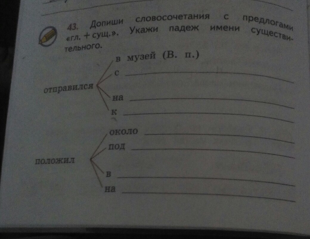 отправился с мамой(т.п.),отправился на улицу(в.п.),отправился к дому(д.п.),положил около друга(р.п.),положил под учебник (в.п.),положил в карман(в.п.),положил на стол(в.п.)