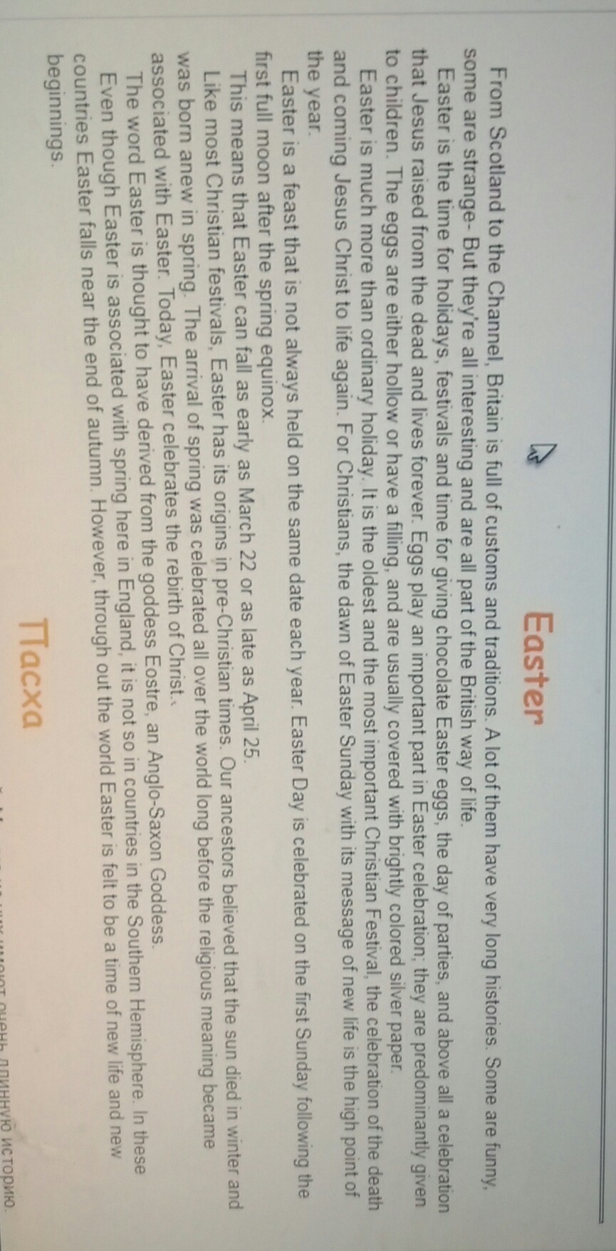 Scotland to the Channel, Britain is full of customs and traditions. A lot of them have very Easter is the time for holidays, festivals and time for giving chocolate Easter eggs, the day of parties, and above all a celebration that Jesus raised from the dead and lives forever. Eggs play an important part in Easter celebration; they are predominantly given to children. The eggs are either hollow or have a filling, and are usually covered with brightly colored silver paper.long histories. Some are funny, some are strange- But they're all interesting and are all part of the British way of life.