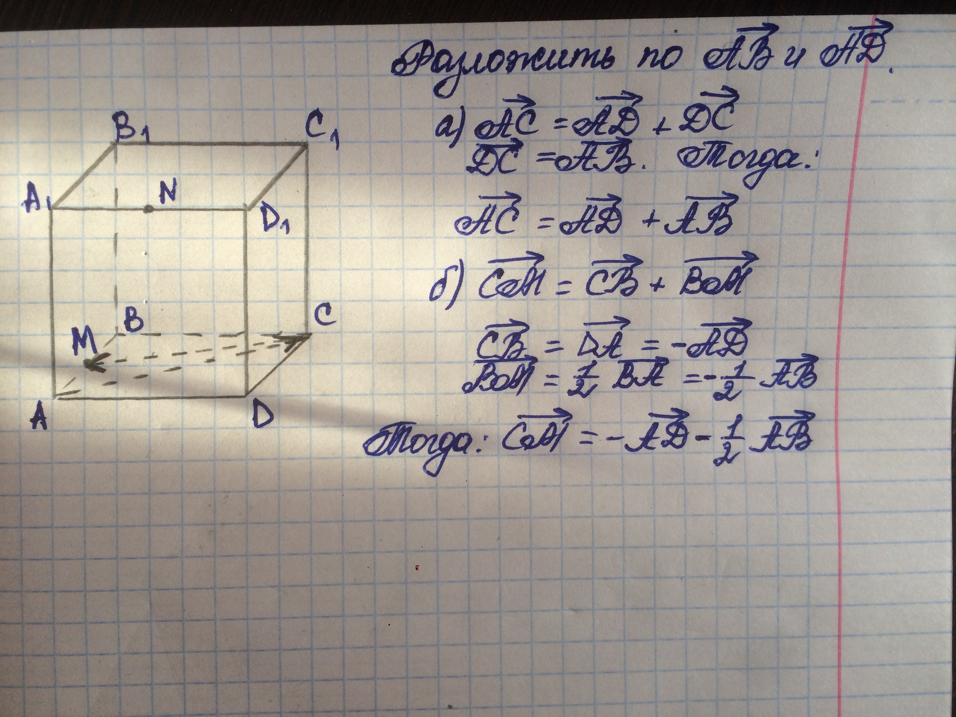 Точки М и N являются серединами ребер АВ и A1D1 параллелепипеда ABCDA1B1C1D1. Разложите, если это возможно, по векторам АВ и AD вектор: а) AC; б) СМ;