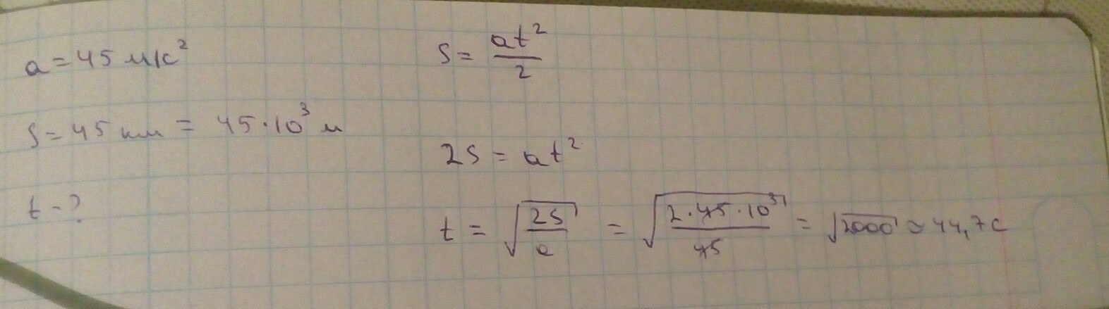 Космическая ракета стартует с космодрома с ускорением 45 м/с2. За какое время она поднимется на 45 км.