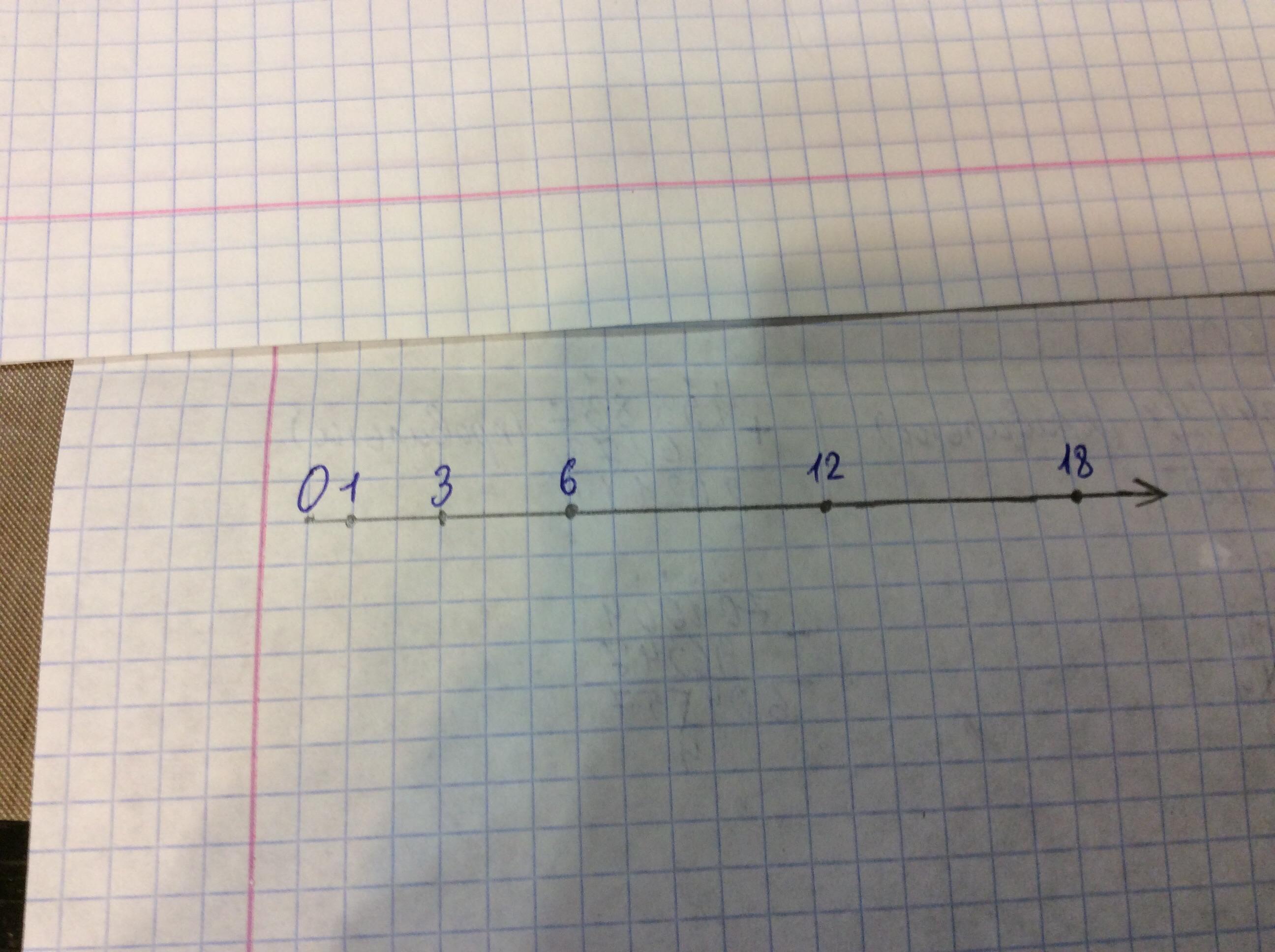 Начертите луч с началом в точке О. Отступитеот точки О вправо три клетки, отметьте полученную точку и подпишите под ней число 3. Отметьте по коорденатном луче числа 1, 6, 12, 18.