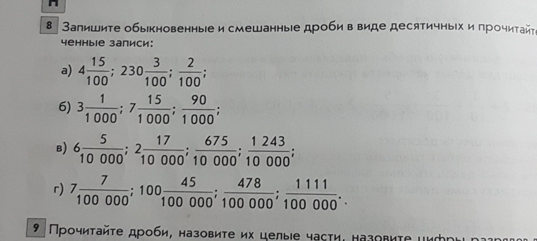 Запишите обыкновенные и смешанные дроби в виде десятичных и прочитайте полученные записи