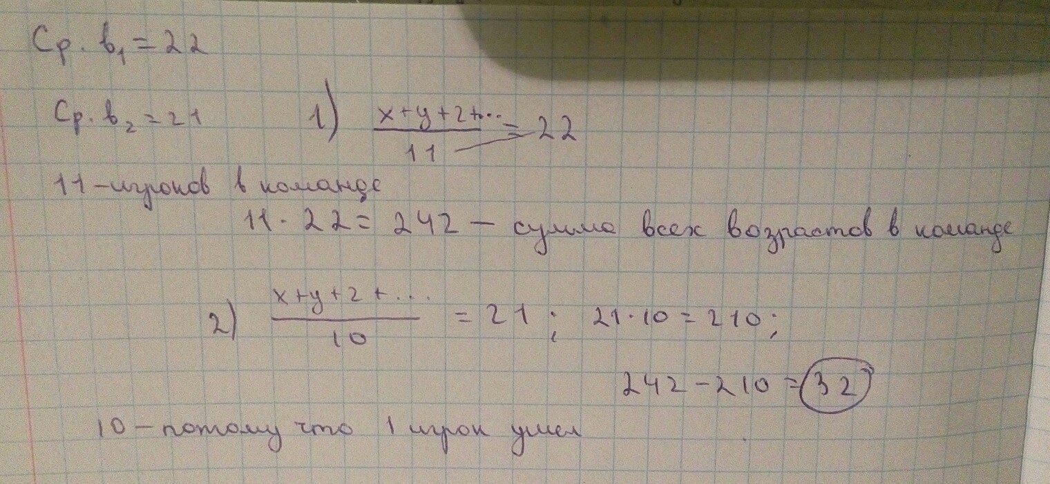 Средний возрост футболистов команды составлят 22 года.Во время игры один из членов команды вышел,после этого средний возраст футболистов составил 21 год. Сколько лет было футболисту который вышел ?