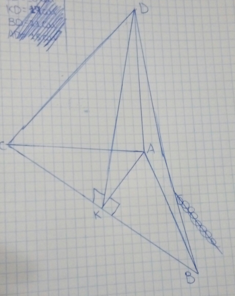 Үшбұрыш қабырғалары 10см, 17см жане 27см. Оның үлкен бұрыштарының төбесі А нүктесінен үшбұрыш жазықтығына. AD=15см. D нүктесі мен үшбұрыштың үлкен қабырғасының арақашықтығын табыңдар.