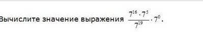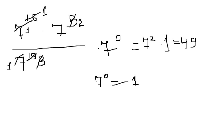 ми скорочуєм нижній степінь числа з верхніми.19-16= 3.Тобто буде знизу сім в третьому степені .Тоді скорочуємо сім в пятому степені з нижньою сімкою в третьому степені .Виходить 7 в другому степені = 49.А 7 в 0 степені це одиниця.Множим 49 на 1 = 49