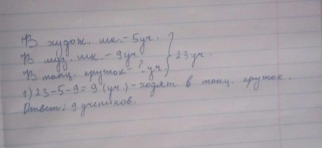 классе 5 учеников ходят в художественную школу 9 учеников в музыкальную остальные в танцевальный кружок сколько детей ходит танцевальный кружок если всего в классе 23 ученика?