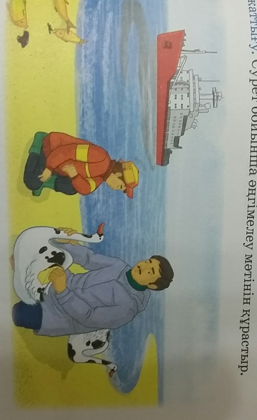 Теңізде алып кеме жүзіп келеді.Ол мұнай тасымалдаушы кеме.Кенеттен кеме қатты соққы алып,мүңай теңізге төгілді.Теңіздің бетін майлы қара мұнай басты.Теңізде жүрген құстардың қанаттары қап қара май болды.Олар жағалауға қашып шықты.Мәди оларға көмектескісі келді,әкесін шаөырып екеуі құстардың қанаттарын тазартты.Теңіз толқыны қатты болғаны соншалық су жәндіктері,балықтар жағалауға шықты.Бұның бәрі адам қолымен жасалған апаттар.