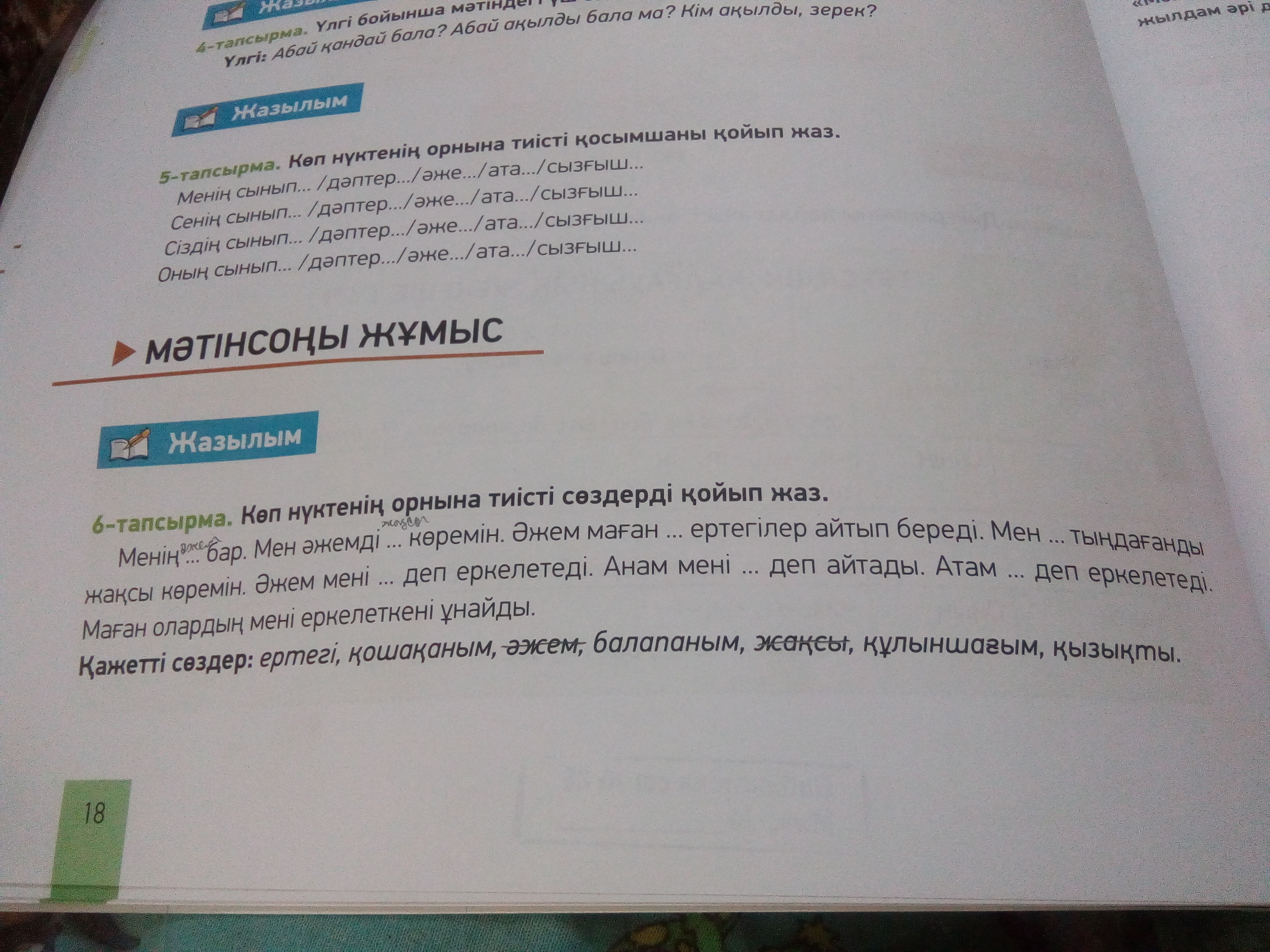 Менің жем бар. Мен əжемді жақсы көремін. Əжем маған қызықты ертегілер айтады. Мен ертегі тындағанды жақсы көремін. Əжем мені құлыншағым деп еркелетеді. Анам мені балапаным деп айтады. Анам қошаққошақаным деп еркелетеді. Маған олардың мені еркелеткені ұнайды.