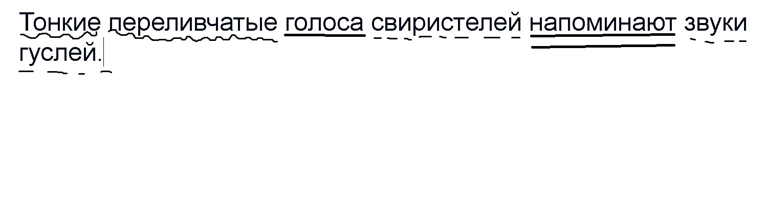 Разбор ниже. Тонкие- прил. Переливчатые-прил. Голоса-сущ,И.П. Свиристелей-сущ,Р.П. Напоминают-глагол. Звуки- сущ,В.П. Гуслей-сущ,В.П.