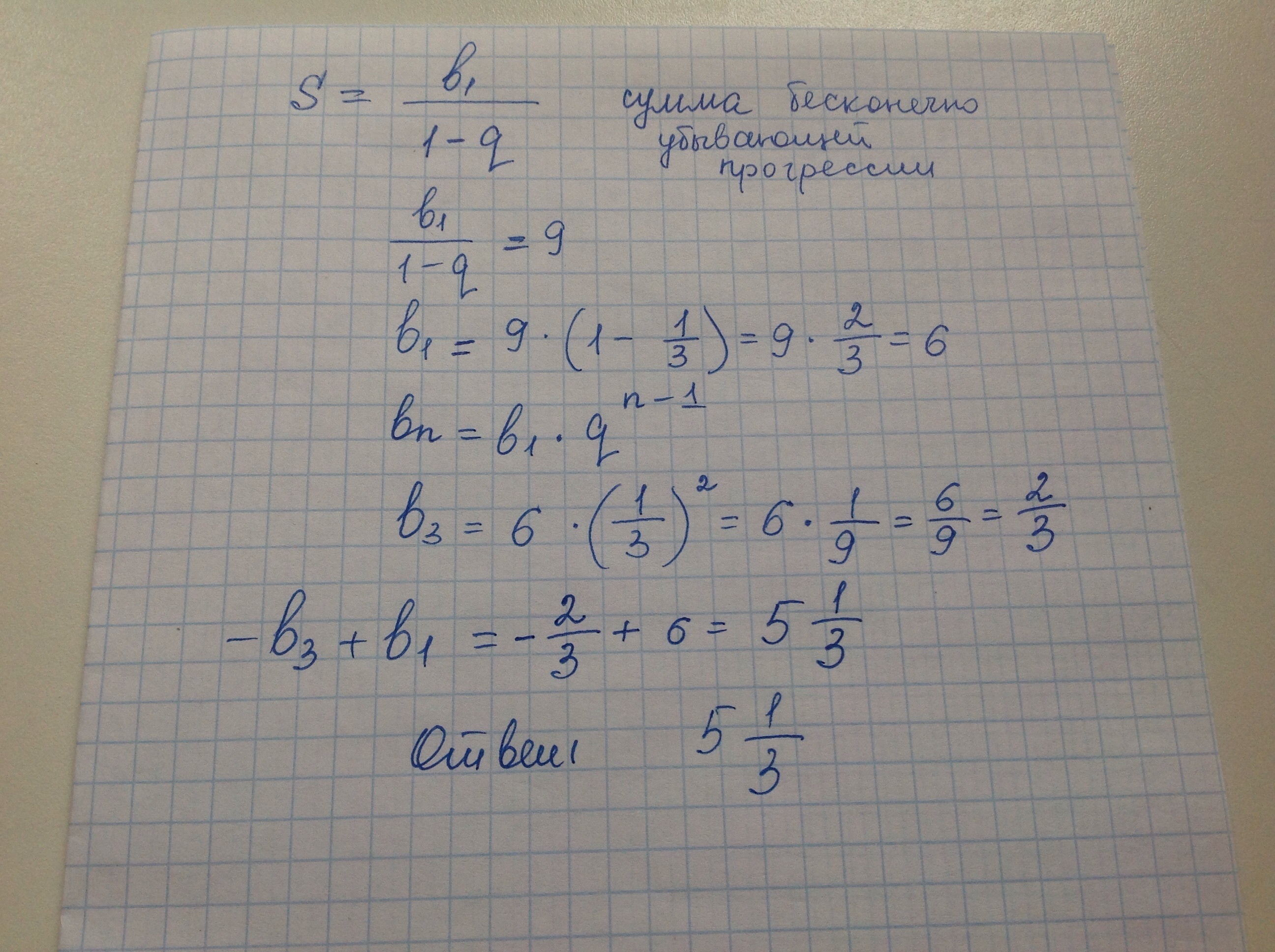 найдите разность между первым и третьим бесконечно убывающей прогрессии если сумма этой прогресии равна 9 а ее знаменатель равен 1/3