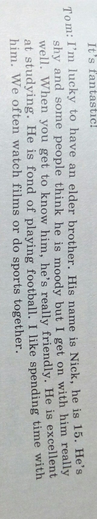 Том: Мне посчастливилось иметь старшего брата. Его зовут Ник, ему 15. он застенчив и некоторые люди думают что он угрюмый но я лажу с ним очень хорошо. Когда вы узнаете его он очень дружелюбный. Он очень хорош в учёбе. Он увлечён футболом. Мне нравится проводить с ним время. Обычно мы смотрим фильмы или занимаемся спортом.