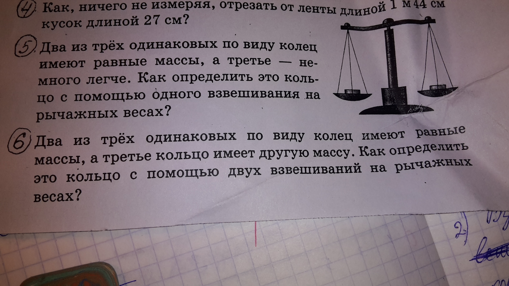 допустим мы взяли два любых кольца и взвесили. если кольца не в равновесии то снимаем одно кольцо и ставим на его место другое. если кольца не стали в равновесие то кольца с другой массой то что было нетронутым. а если стало в равновесии то кольцо с другой массой то что только что мы сняли. как то так