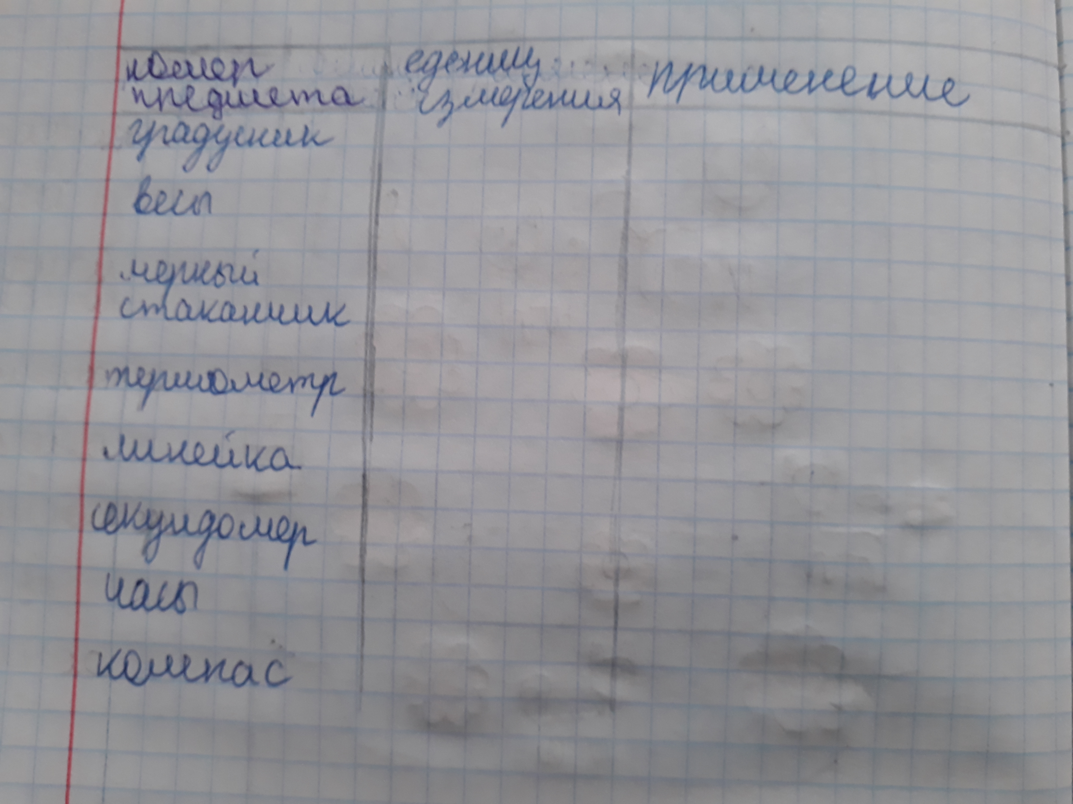 Помогите заполнить таблицу пожалуйста! Первый столбик - назаание предмета, второй - еденица измерения, третий - применение
