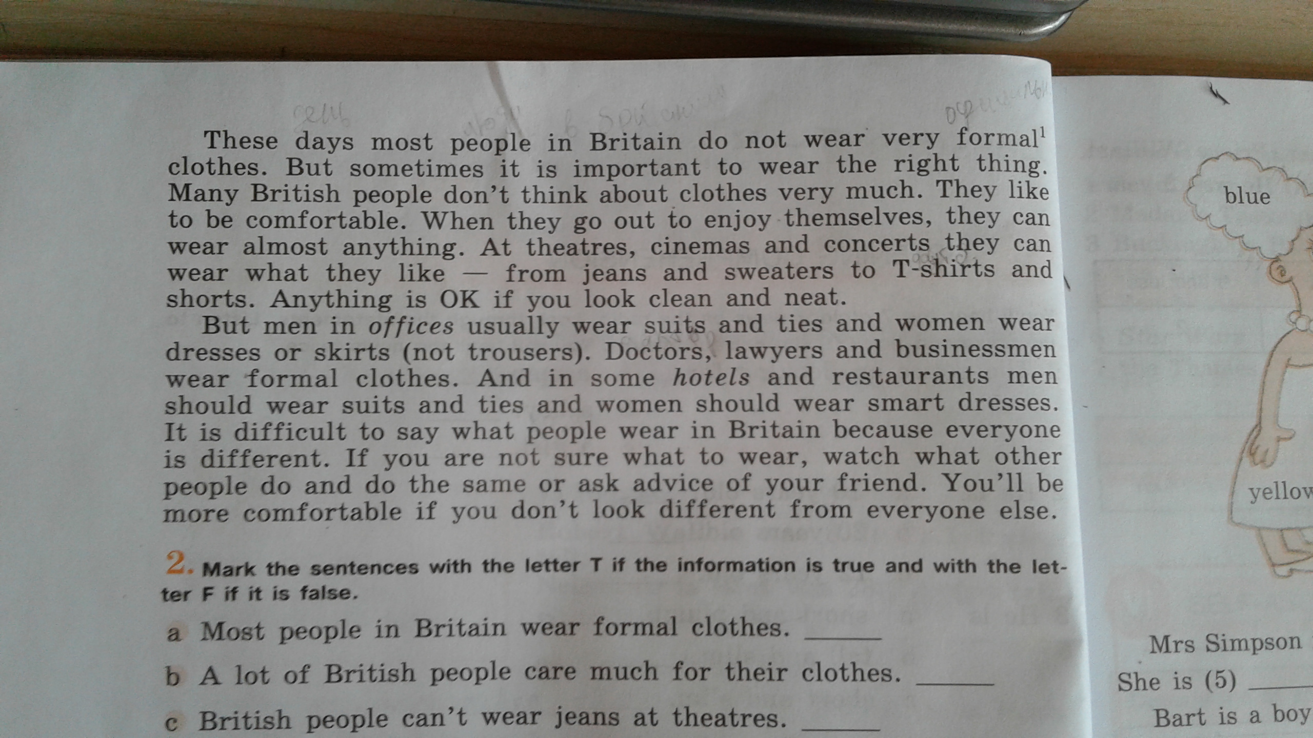 В наши дни большинство людей в Британии не носят очень формальной одежды. Но иногда важно носить правильные вещи. Многие британцы не очень много думают о одежде. Им нравится быть комфортно. Когда они выходят, чтобы наслаждаться, они носят почти все. В театрах, кинотеатрах и концертах носят то, что им нравится, от джинсов и свитеров до футболок и шорт. Все в порядке, если вы выглядите чистым и аккуратным. Но мужчины в офисах обычно носят костюмы и галстуки, а женщины носят платья или юбки (а не брюки). Врачи, юристы и бизнесмены носят официальную одежду. А во мне гостиницы и рестораны мужчины должны носить костюмы и галстуки, а женщины должны носить шикарные платья. Трудно сказать, что люди носят в Британии, потому что все разные. Если вы не уверены в том, что надеть, посмотрите, что делают другие люди, и сделайте то же самое или попросите совета у своего друга. Вам будет удобнее, если вы не будете отличаться от всех остальных. 2, Отметьте предложения буквой T, если информация верна и с датой F, если она ложна. Большинство людей в Британии носят официальную одежду. b Многие британские люди много заботятся о своей одежде. Британские люди не носят джинсы в театрах