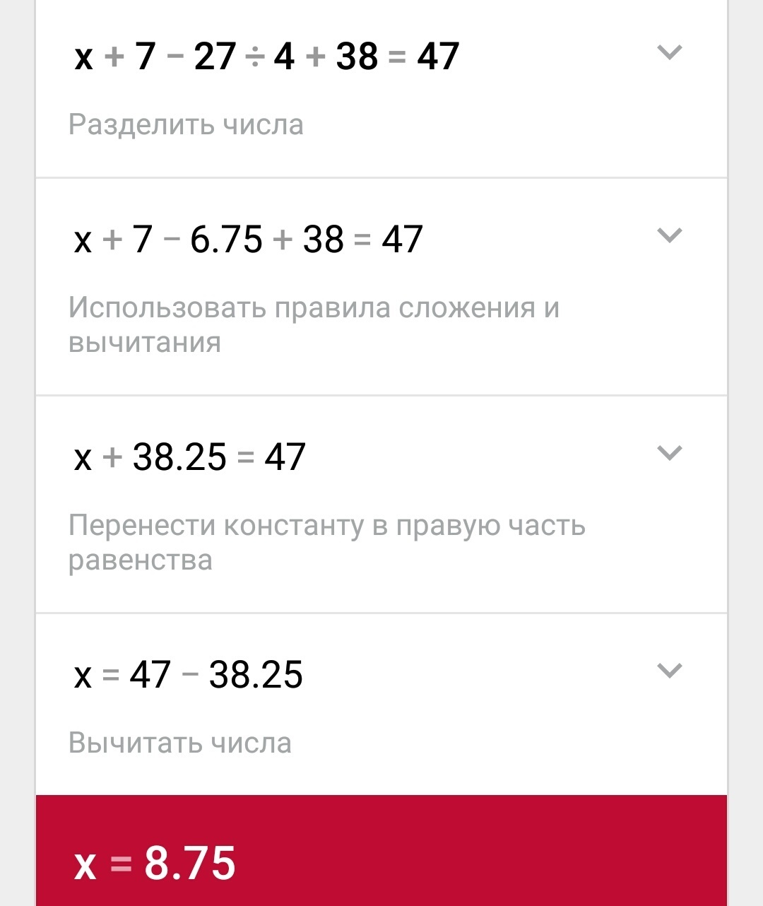 7х = 47 + 27 : 4 = 38