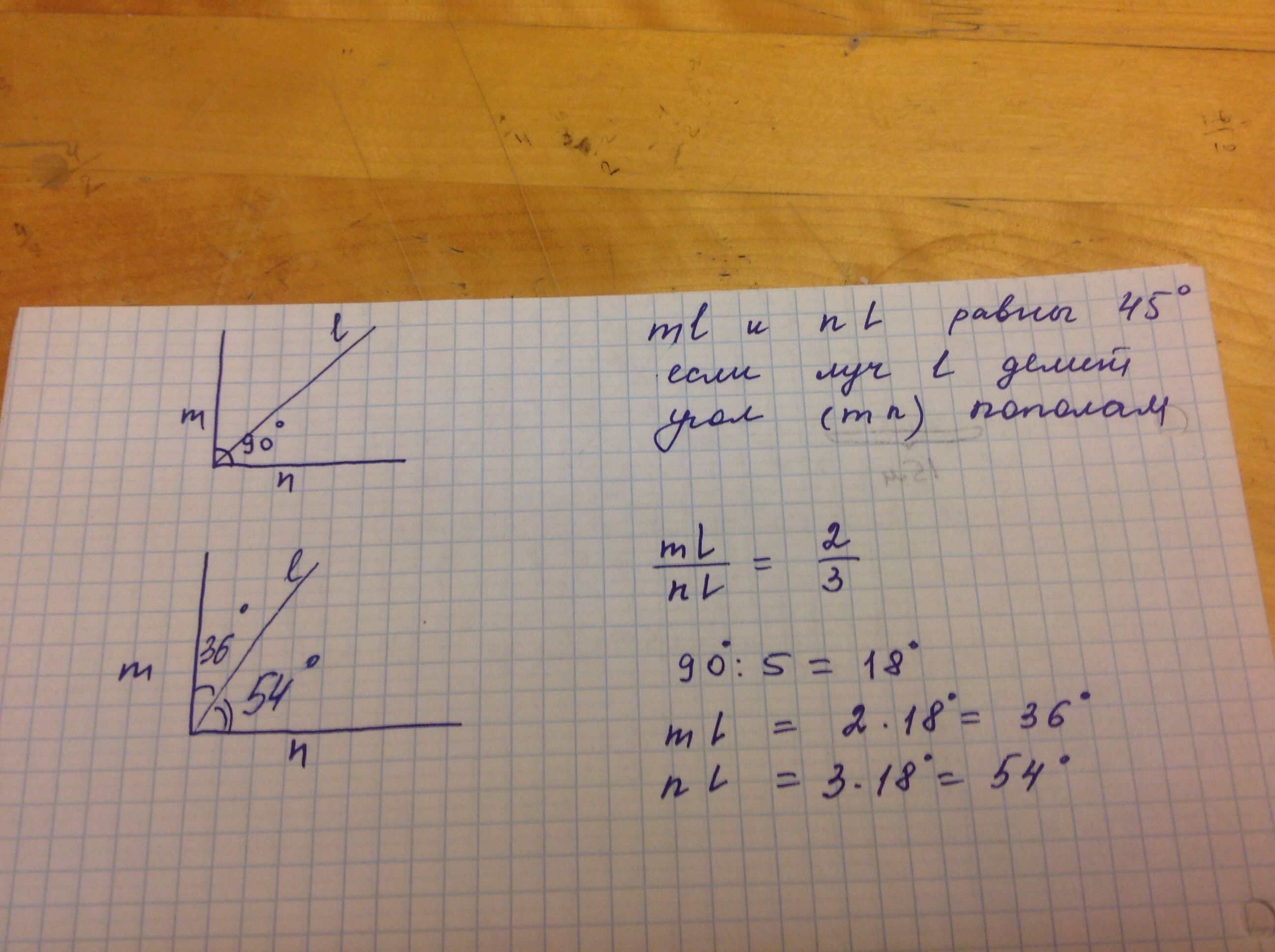 Между сторонами угла (mn) равного 90 градусов, проходит луч l. Найдите углы (ml) и (nl), если: 1) луч l делит угол (mn) пополам; 2) градусные меры углов (ml) и (nl) относятся как 2:3