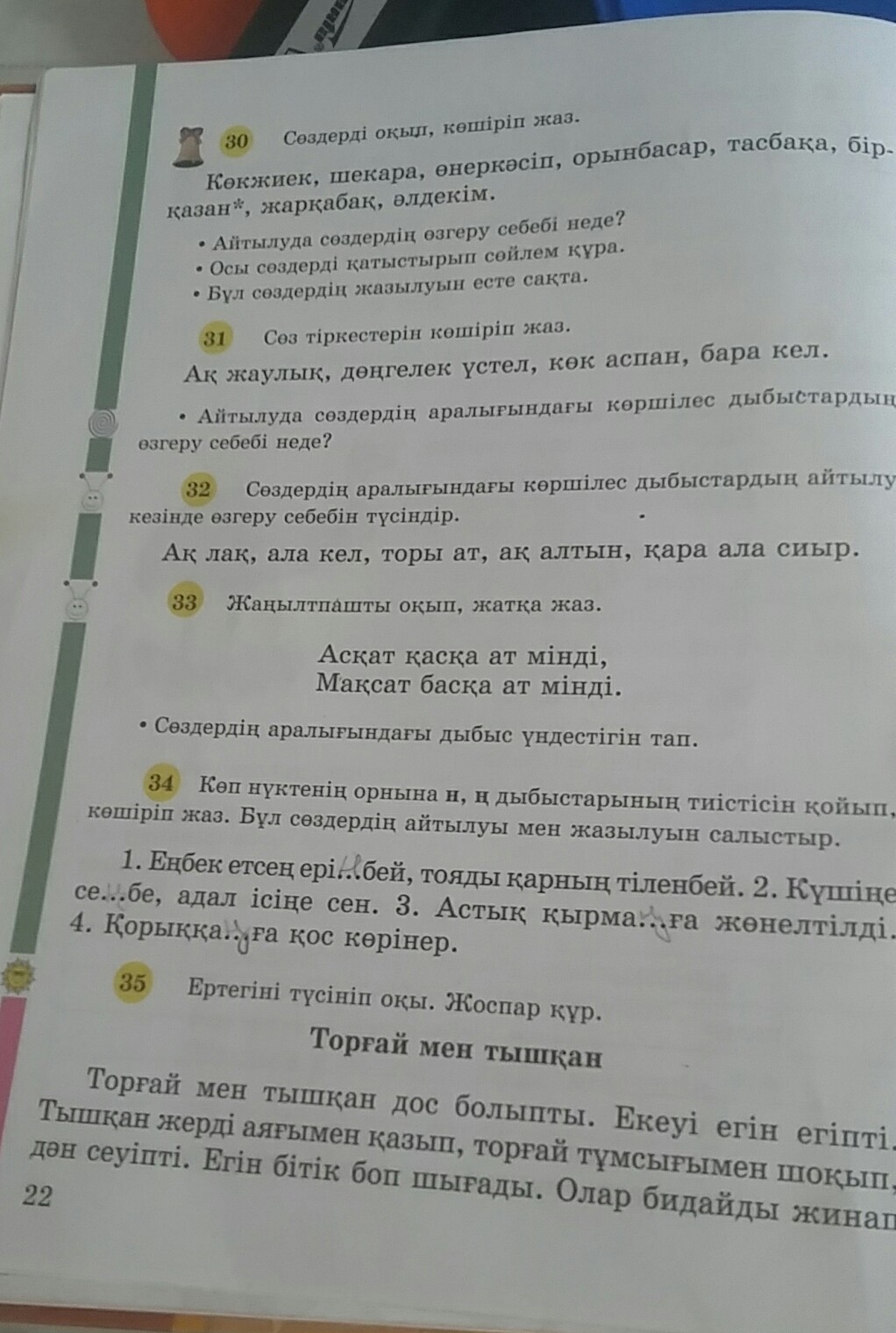 34жаттығу Еңбек етсең ерінбей,тояды қарның тіленбей.Күшіңе сенбе,адал ісіңе сен.Астық қырманға жөнелтілді.Қорыққанға қос көрінер.