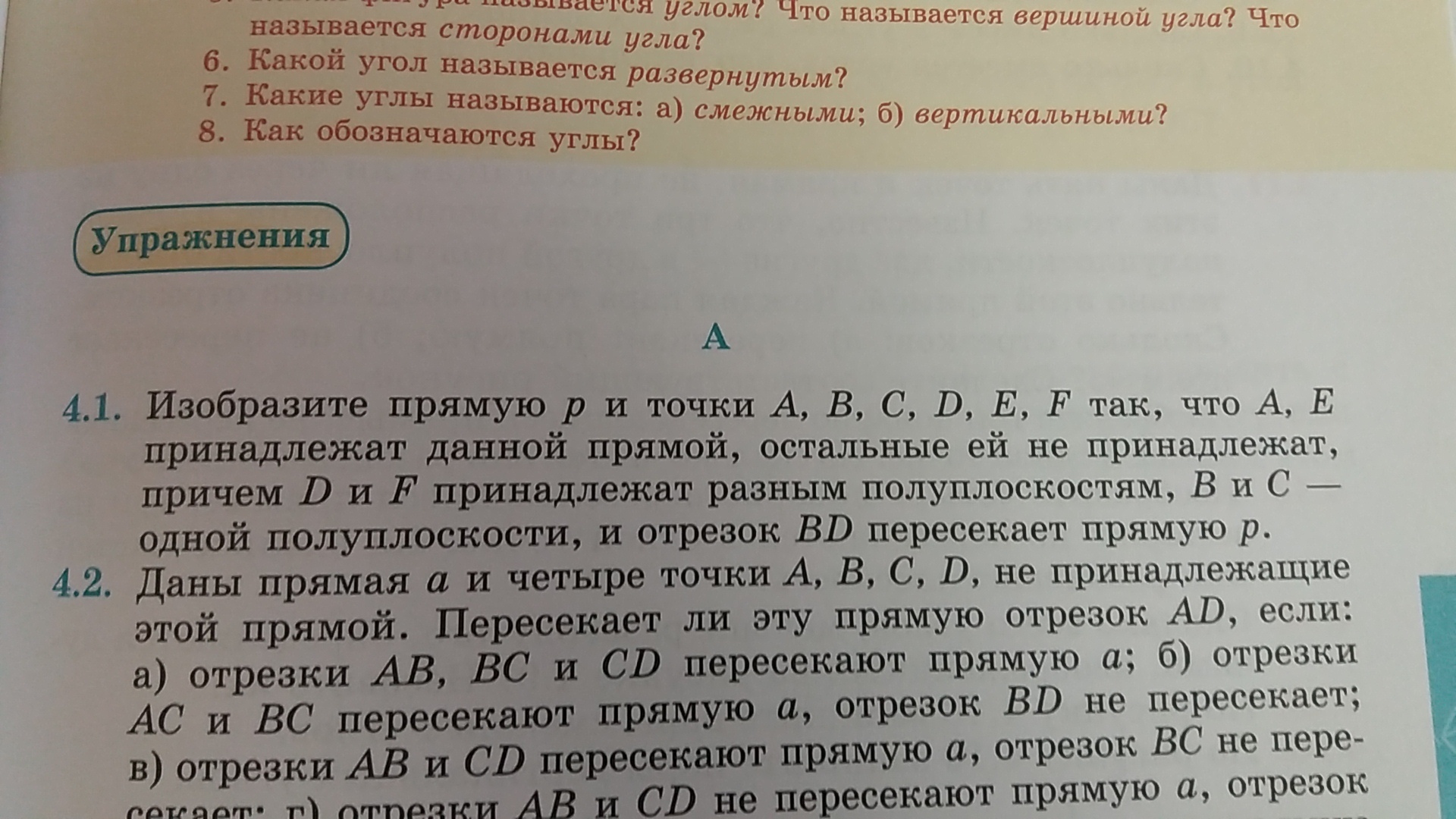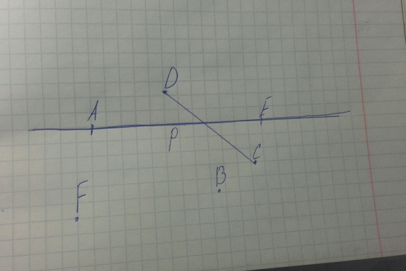 Рисуем прямую, отмечает ее p. A и F лежат на ней. При этом D и F принадлежат разным плоскостям, а C и B одной. Отрезок DC пересекает прямую p