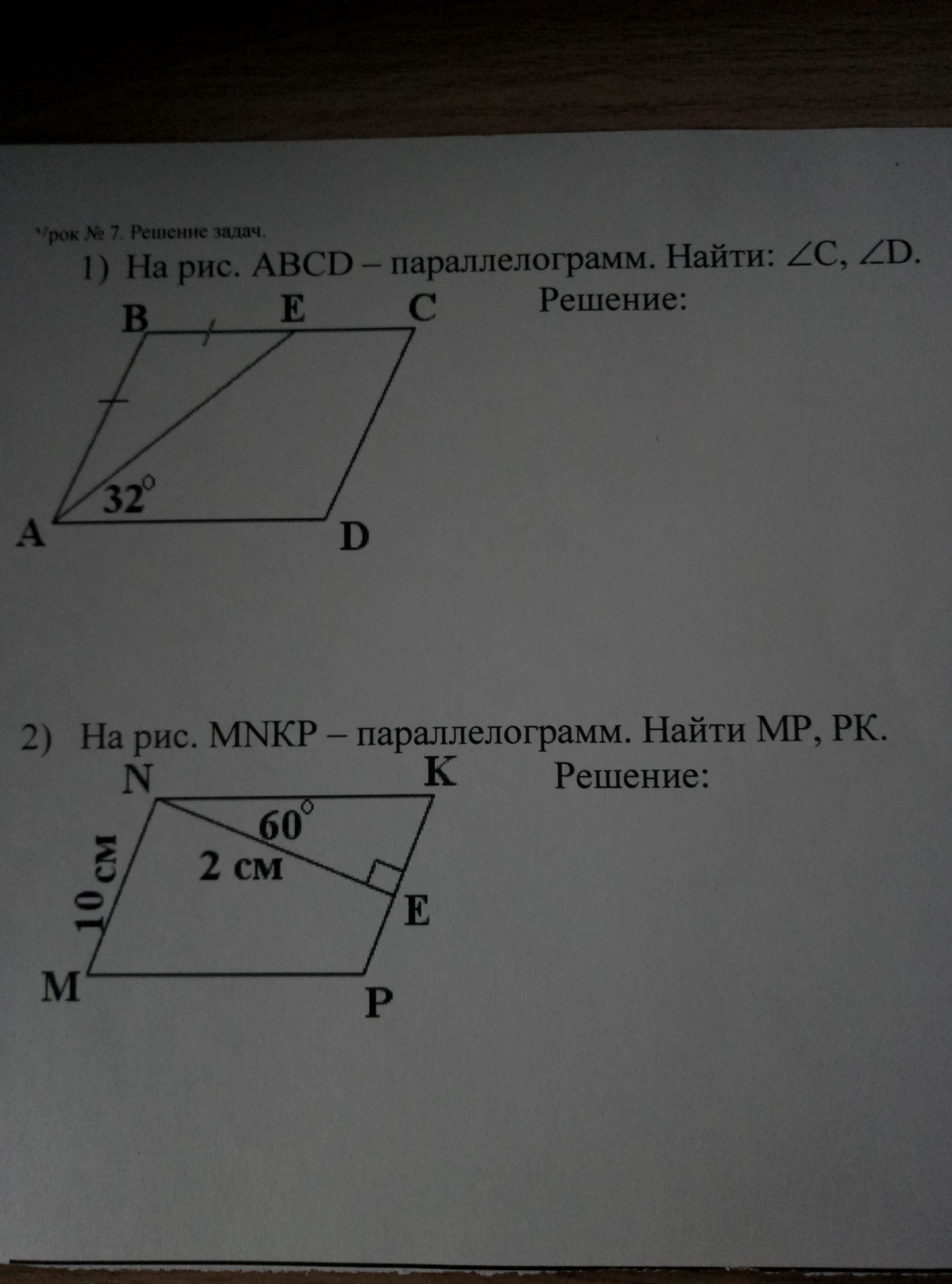 2)Т.к.MN=10 то PK=10 (свойство параллелограмма-параллельные равны), угол К в треугольнике NKE=30 градусов, а напротив угла в 30 градусов лежит катет равный половине гипотенузы.