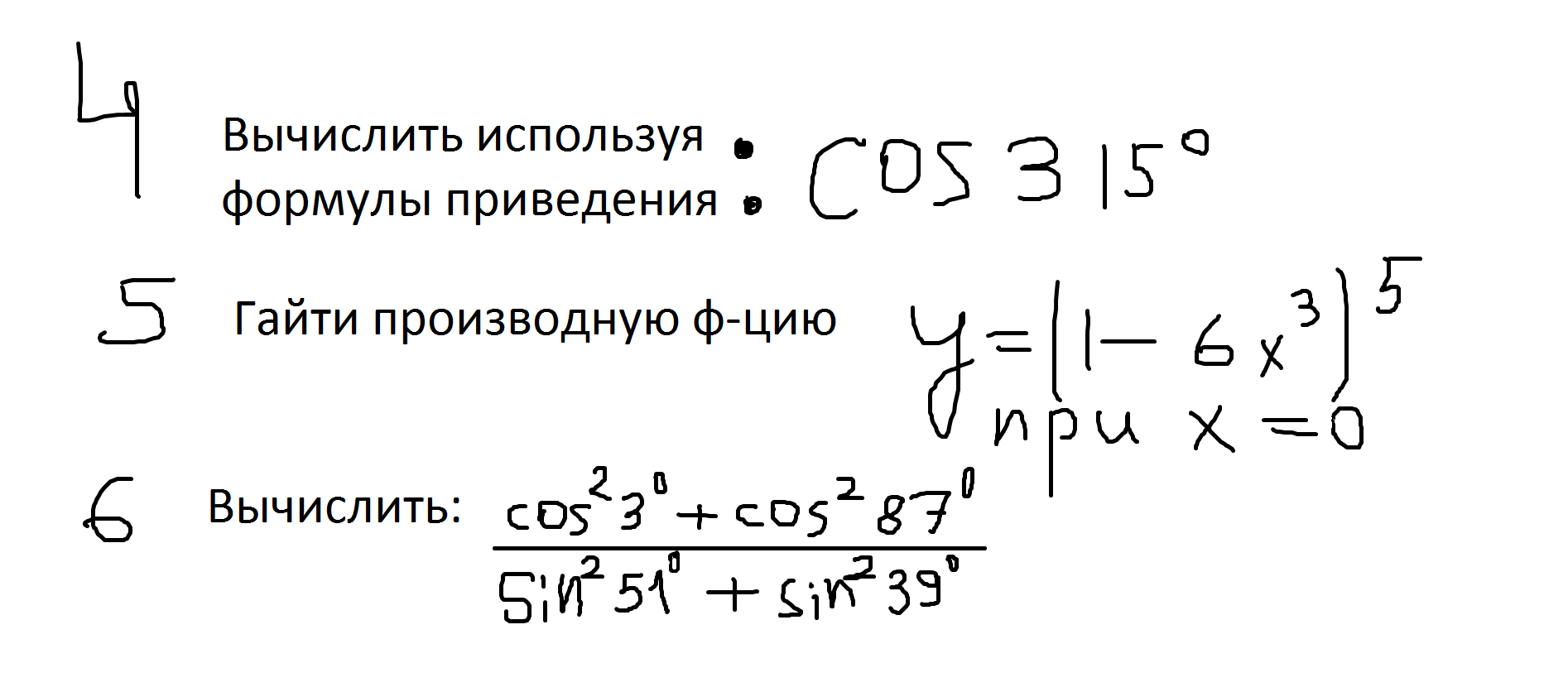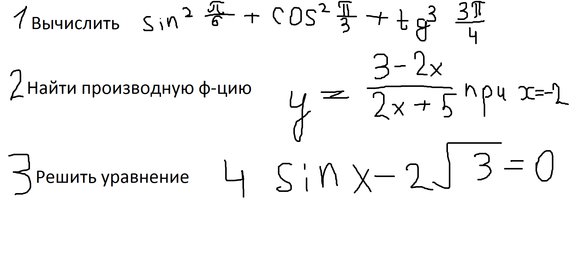 1) sun^2frac{pi}{6}=(frac{1}{2})^2=frac{1}{4}, cos^2frac{pi}{3}=(frac{1}{2})^2=frac{1}{4},\tg^3frac{3pi}{4}=tg^3(pi -frac{pi}{4})=(-tgfrac{pi}{4})^3=(-1)^3=-1\frac{1}{4}+frac{1}{4}-1=frac{1}{2}-1=-frac{1}{2}\2)y`=frac{-2(2x+5)-2(3-2x)}{(2x+5)^2}=frac{-16}{(2x+5)^2},y`(-2)=frac{-16}{1^2}=-16\3)sinx=frac{sqrt{3}}{2},x=(-1)^nfrac{pi}{3}+pi n, nin Z\4)cos315^0=cos(360^0-45^0)=cos45^0=frac{sqrt{2}}{2}\5)y`=5(1-6x^3)^4cdot (-18x^2)=-90x^2(1-6x^3)^4\y`(0)=0\6)3^0+87^0=90^0