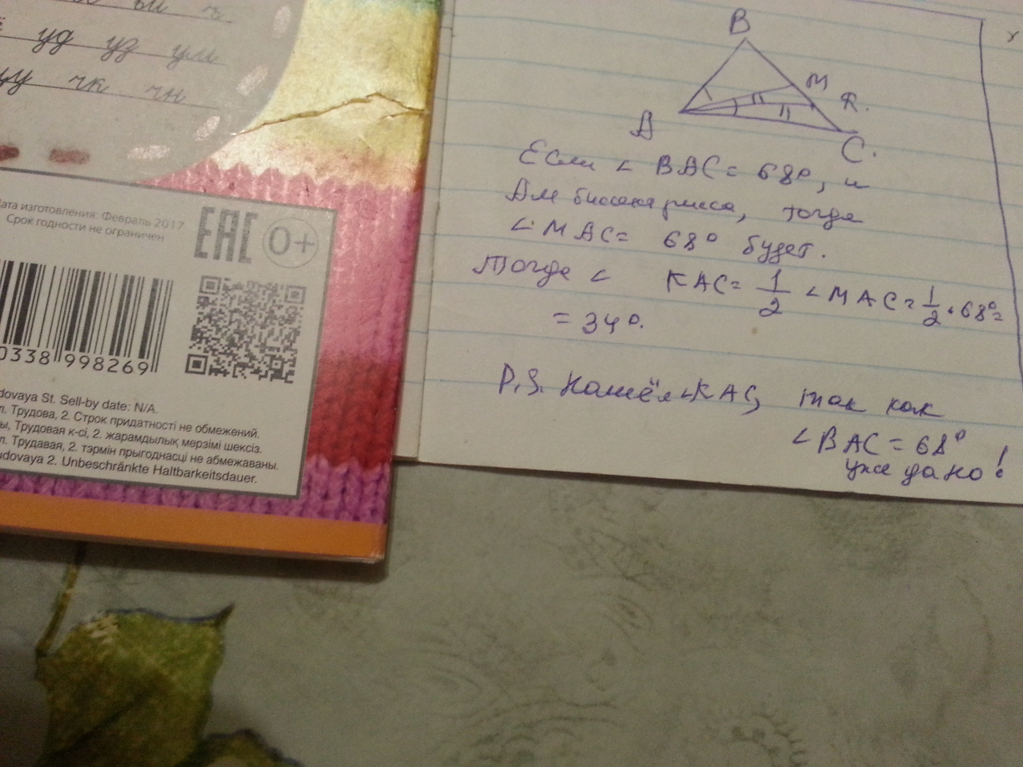 Известно что угол BAC = 68 градусов AM- биссектриса угла BAC, AK- биссектриса угла MAC. Найдите градусную меру угла BAC