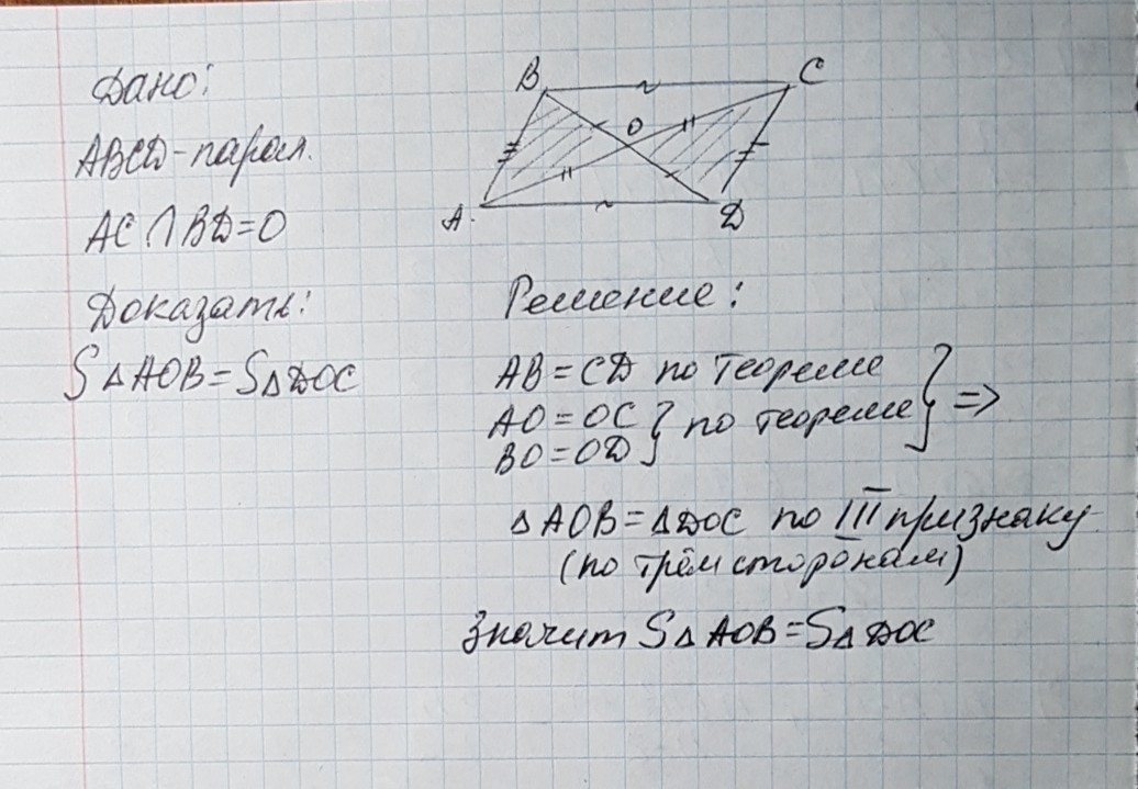 Диагонали параллелограмма АВСD пересекаются в точке О. Докажите, что треугольники АОВ и DOC равновеликие.