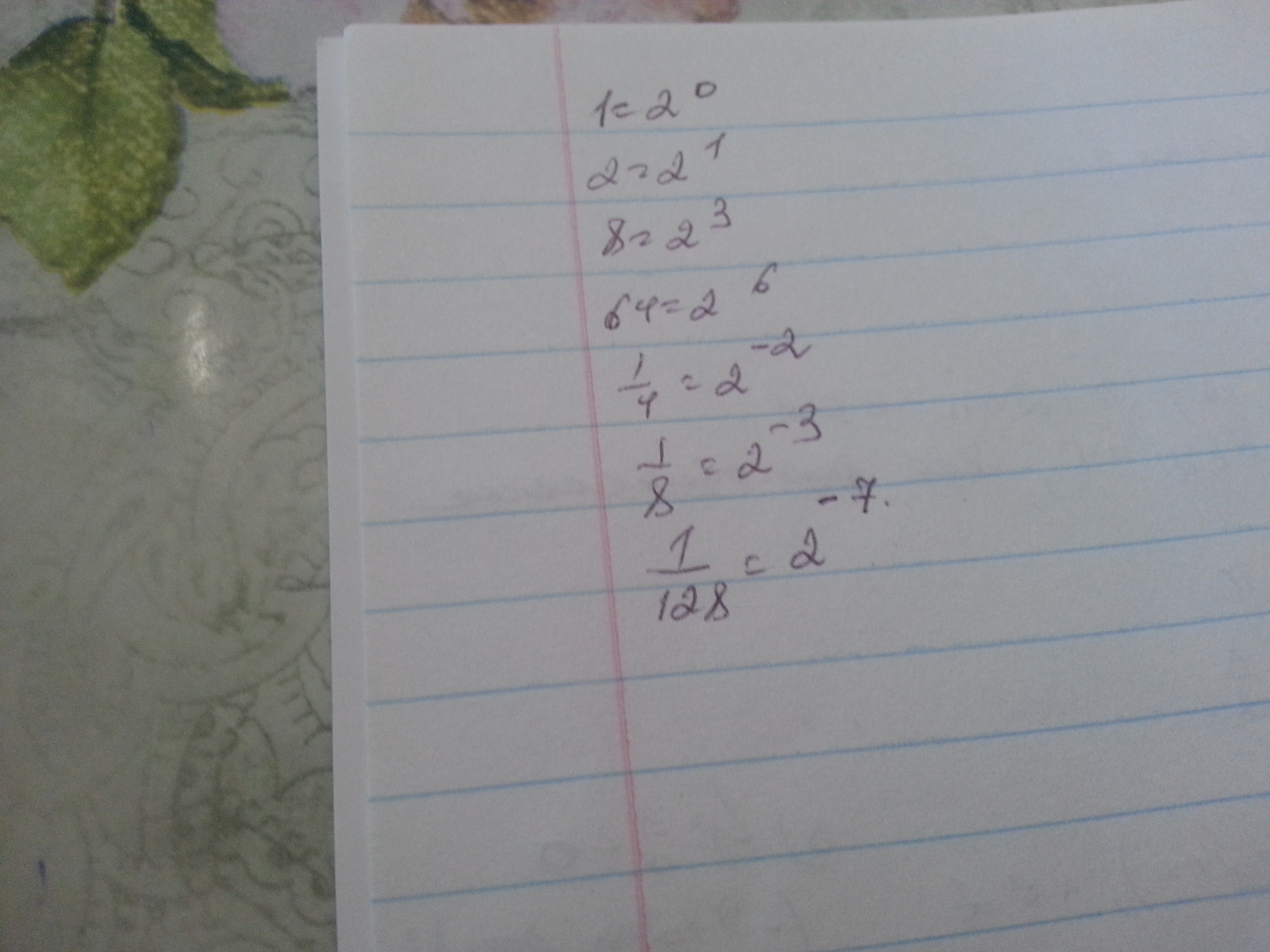 1 = ; 2 = ; 8 = ; 64 = ; 1/4 = ; 1/8 = ; 1/128 = в виде степени с основанием 2.