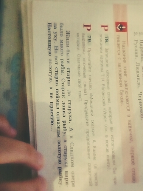 Старик конечно же удивился, так как до этого ни разу не видел подобных рыб. Но тут к удивлению старика рыба начала говорить: "Старик, старик отпусти меня я выполню любое твоё желание. После слов сказанных рыбкой старик почесал репу и начал думать что бы загадать. Пошёл старик к старухе, приходит, а старуха сидит и ждёт его с уловом. Увидев одну рыбы в ведре старуха спросила: "Почему же ты ничего не поймал, что же мы будем кушать сегодня?" Старик начал обьяснять старухе о том что сказала ему рыбка и старуха услышав это начала придумывать что бы она хотела. Старик предложил старухе загадать рыбке внучку красавицу, но старуха была против, а хотела лишь золота да серебра. Такой ответ очень разочаровал старика и поздней ночью он ушёл от старухи вместе с рыбкой. Ночью было плохо видно, но старик знал куда идти и помнил путь к своей избушке о которой старуха не знала и там он загадал рыбке доченьку красавицу и начал с ней жить поживать да добра наживать.
