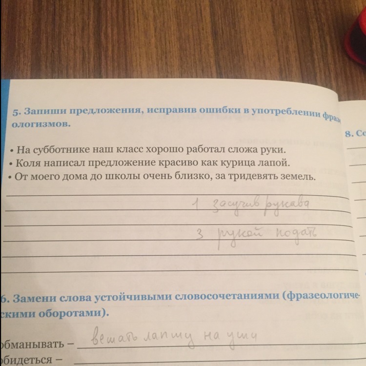 1. На субботнике наш класс работал сложа руки.2. Коля написал предложение,как курица лапой.3.От моего дома до школы очень далеко, за тридевять земель.