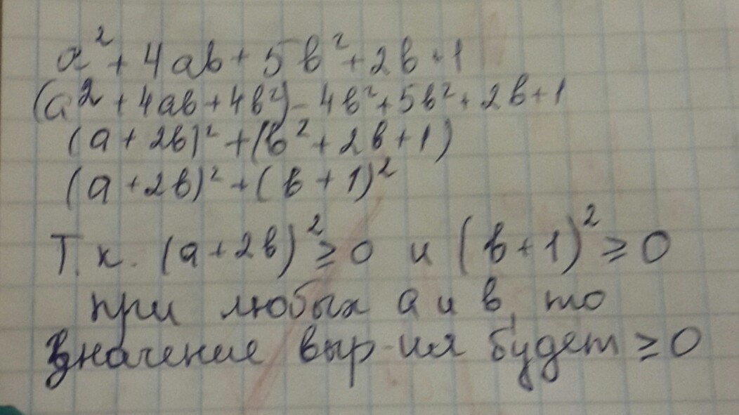 какой знак имеет значение выражения a^2+4ab+5b^2+2b+1 при любых значениях переменной?