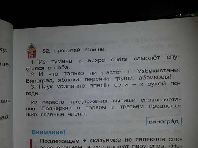 Словосочетания из первого предложения - в вихре снега,спустился с неба, спустился из тумана.