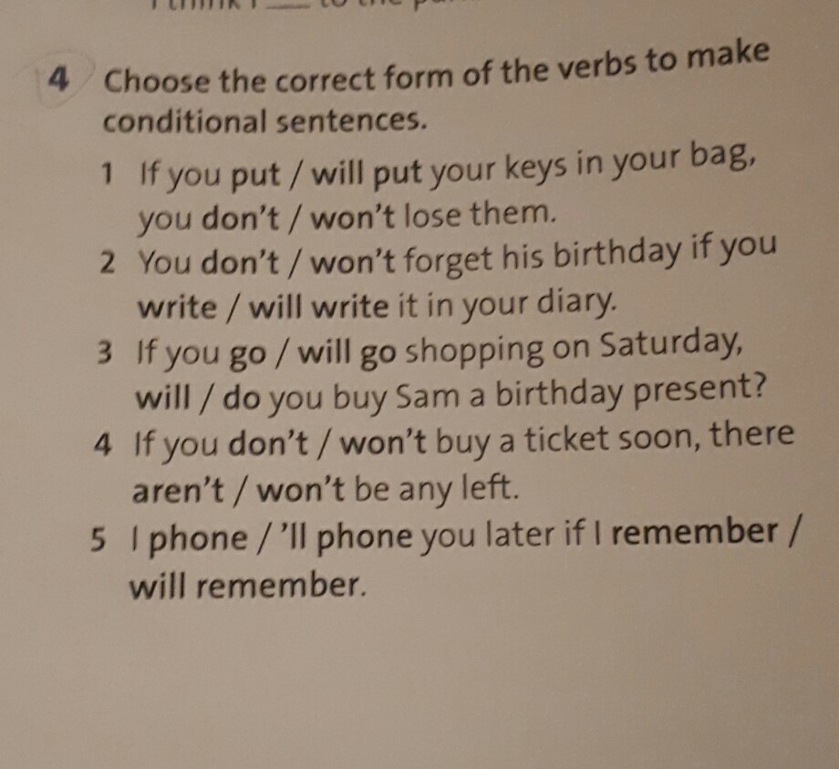 1put, don't. 2won't, will write. 3will go, do. 4don't, aren't. 5I'll phone, will remember.