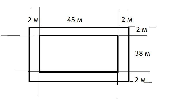 Длина водоёма прямоугольной формы равна 45 с, а ширина 38 м. На расстоянии 2 м от водоёма поставили изгородь. Найдите длину изгороди.