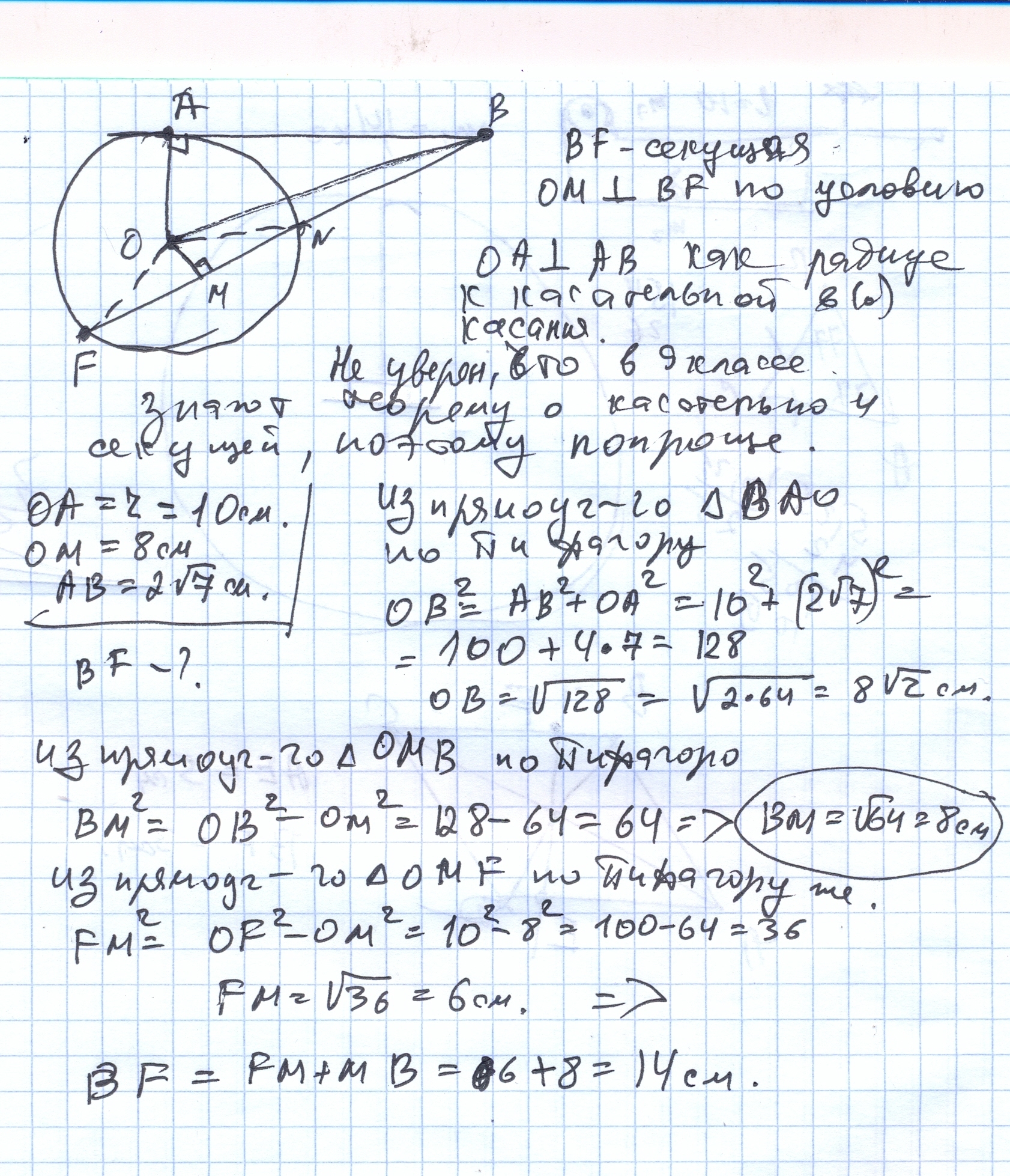 Радиус окружности равен 10 см, из точки вне окружности проведены к ней касательная длиной 2√7 и секущая расстояние которой от центра окружности равно 8 см