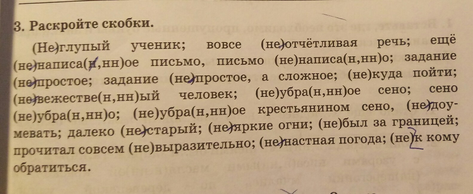 Неглупый человек, вовсе не отчетливая речь, ещё не написанное письмо, письмо ненаписанное, задание непростое, задание не простое, а сложное, некуда пойти, невежественный человек, неубранное сено, сено не убрано, не убранное крестьянином сено, недоумевать, далеко не старый, неяркие огни, не был за границей, прочитал совсем не выразительно, ненастная погода, не к кому обратиться.