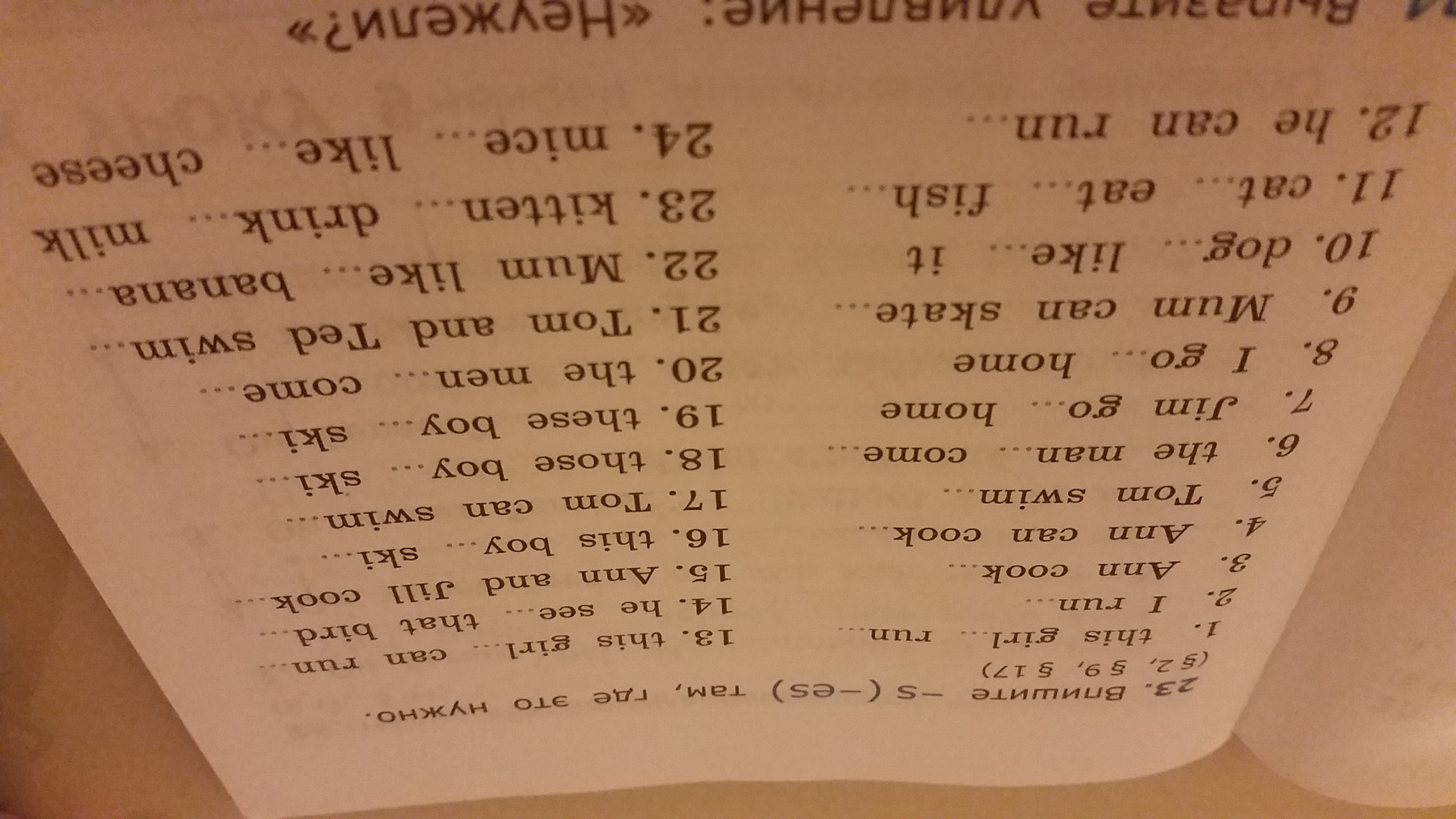 16 (в конце) 19 (после boy) 20 (в конце) 21 ( в конце) 22( и в конце и в начале) 23 ( после drink)