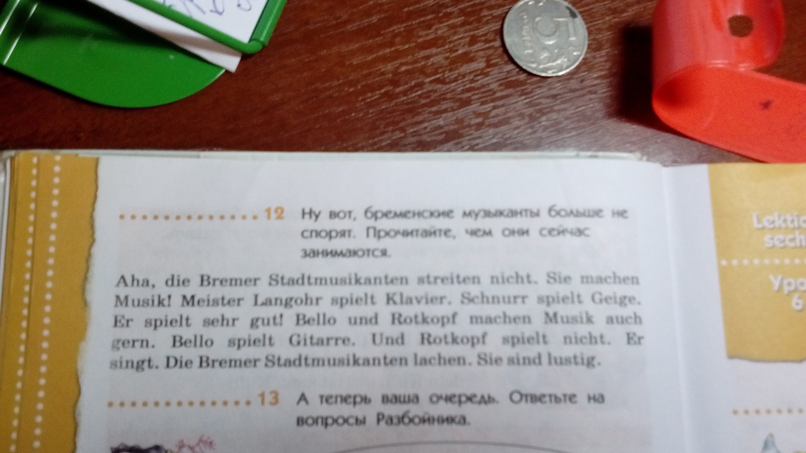 Ага, бременские музыканты не спорят, они делают музыку! Мастер осел играет на пианино, кот играет на скрипке. Он играет очень хорошо! Белло и петуху также нравиться делать музыку. Белло играет на гитаре. А петух не играет. Он поет. Бременские музыканты смеются. Они веселые