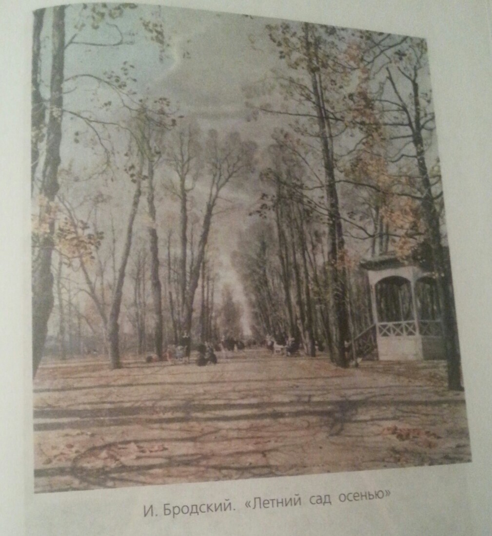 Здравствуй, Женя. Сижу и вспоминаю тебя, нашу прогулку по "Летнему" осеннему. Желтые листья вертолетиками кружились над нашими головами и падали на влажную землю Смотрю на картину Бродского и вспоминаю об этом. Та же широкая аллея, те же голые печальные деревья и редкие прохожие. Одинокая беседка кажется храмом, куда можно убежать от невзгод. Чтобы в нее войти, нужно подняться по крутым лестницам , держась за изящные перила. Наверное, помнишь, как мы скрывались в ней от моросящего дождя и читали друг другу стихи Рубцова : " Улетают листья с тополей... Повторилась в мире неизбежность..." Но на картине дождя нет, и та реальность не совпадает с реальностью художественной. Облака редки, хотя и серы. Бродский использует нежные тона, передающие зыбкость времени. Вот такие мысли, Жень. Как ты там ?