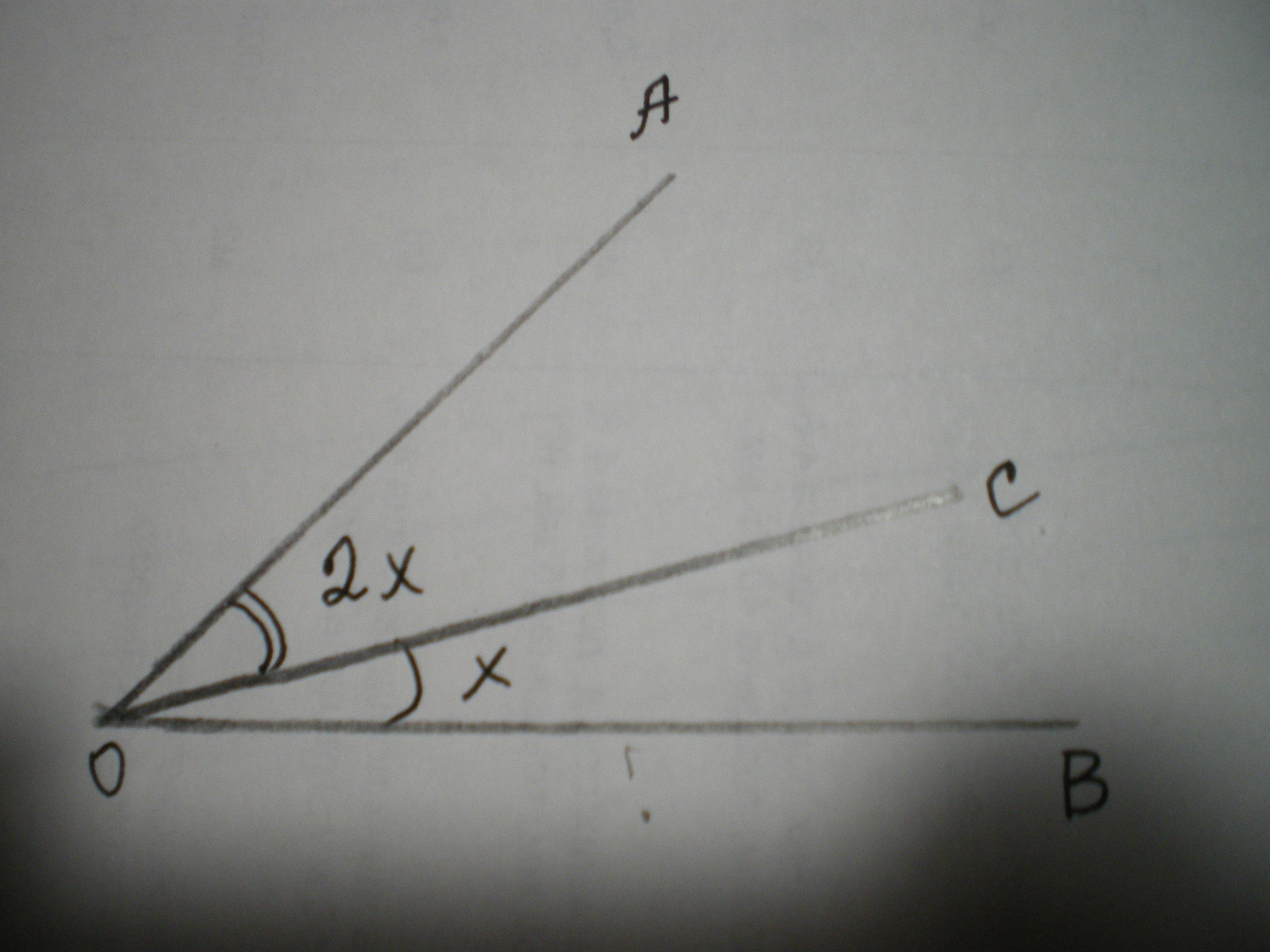 Пусть ∠ВОС=х°, тогда ∠АОС=2х°, тогда их сумма составляет 45°.
