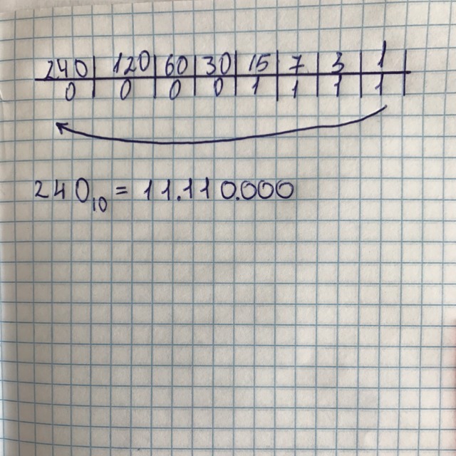 240:2=120(без остатка), в таблице сверху пишем 240, а снизу остаток, если он есть, дальше 120:2=60, и по той же схеме до единицы. Получаем 240 в двоичной степени=11110000