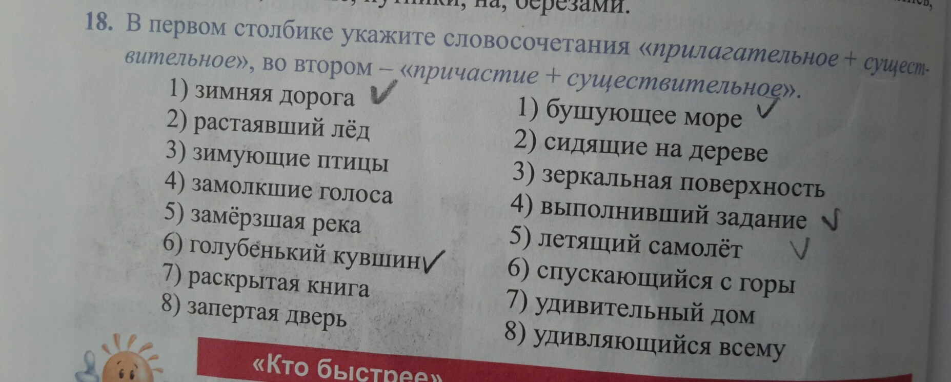 Причастие + существительное: бушующее море, сидящие на дереве, зеркальная поверхность, выполнивший задание, летящий самолет, спускающийся с горы, удивляющийся всему.